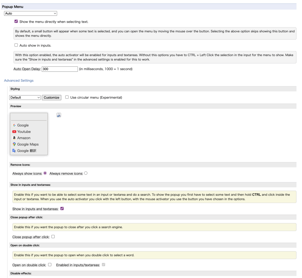 なお、ブラウザ上で文字選択しただけでSearch enginesのメニューを表示したい場合は拡張機能の設定のMenu関連を下記のようにしてください(右クリックやキーボードショートカットと合わせたりもできます)。